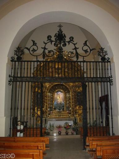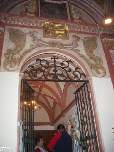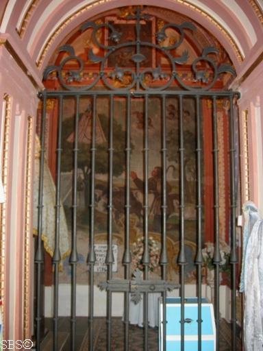Reja y acceso al camarín de la Virgen, al fondo temple con el milagro de la aparición |