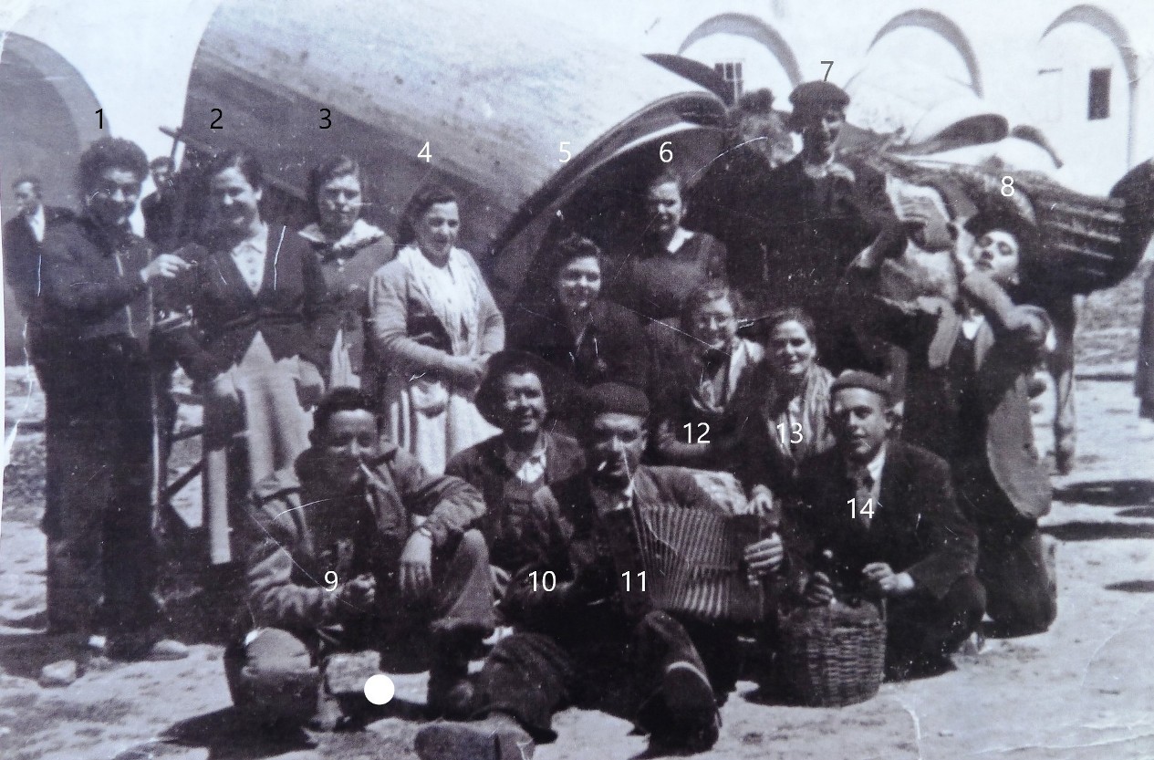 1959. Traida. 1 Enrique Granados. 2 ¿ ?. 3 María Josefa Fernández Alcázar del “liebro”. 4 Ovidia Cano García “calonche”. 5 María Núñez (o María Gracia Vázquez). 6 María Luisa Cano García (hermana de Ovidia). 7 Bartolomé Robles Bellón. 8 ¿ ?. 9 ¿Ángel Granados?. 10 Ignacio Fernández Lozano “calonche”. 11 Alfonso Morales Moya el de “ojancos”. 12 María Cruz Fernández Lozano de “calonche”. 13 María Robles López “la gramera”. 14 Juan Miguel Castro Castro "Maturrillas". |