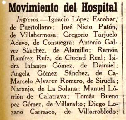 1937. José Nieto Patón es ingresado en el hospital de Ciudad Real. 18-03-1837