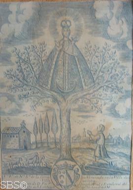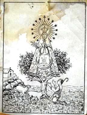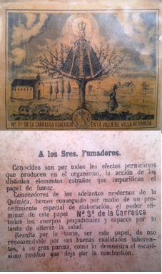 Principios S. XX Imagen litografiada en librillo de papel de fumar. Basada en el grabado del XVIII de Nuestra Señora de la Carrasca |
