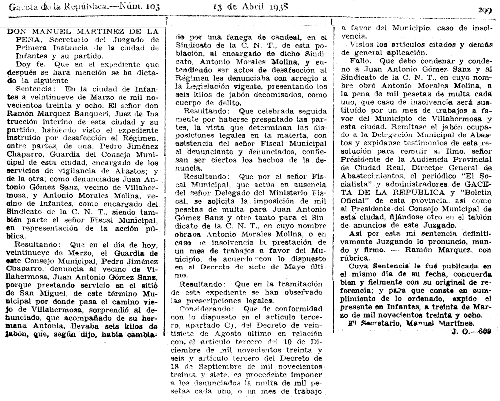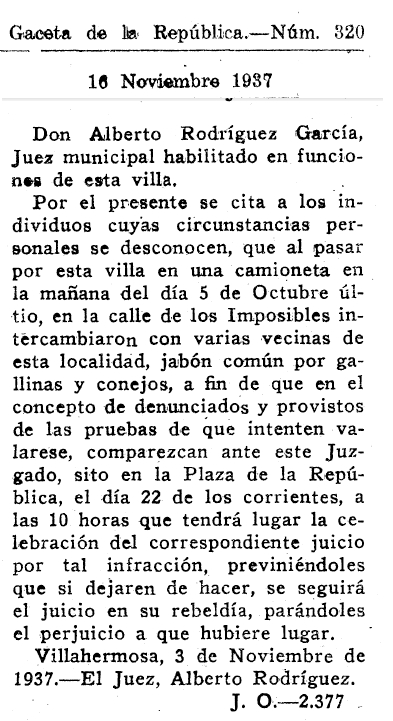 1938. Juan Antonio Gómez Sanz es denunciado por estraperlo de jabón y multado con mil pesetas o un mes de trabajo a favor del municipio
