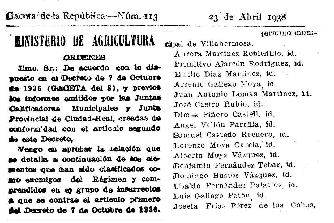 1938. Relación de enemigos del Régimen e insurrectos