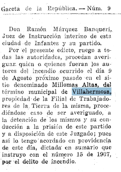1937. Incendio en el sitio denominado Millomas Altas, propiedad de la Filial de Trabajadores de la Tierra