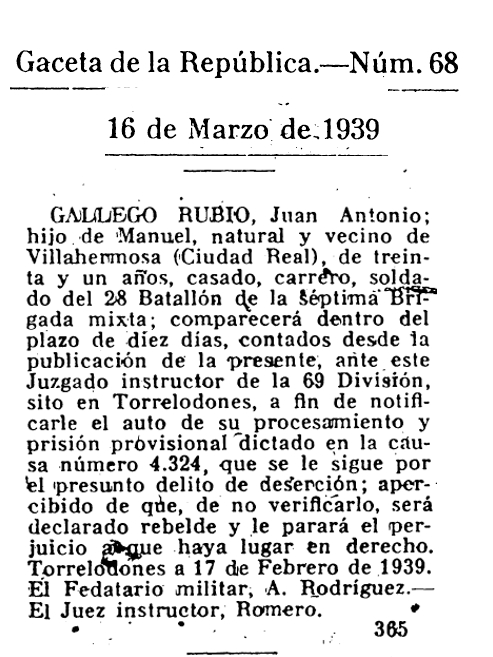 1939. Deserción del soldado Juan Antonio Gallego Rubio