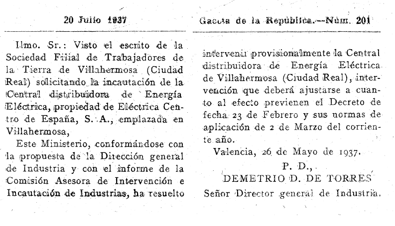 1937. La Sociedad Filial de Trabajadores de la Tierra de Villahermosa, solicita la incautación de la Central distribuidora de Energía Eléctrica