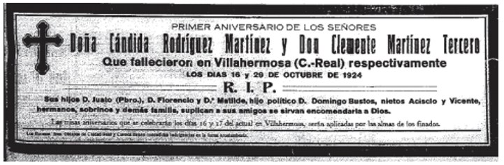 1925 Esquela del primer aniversario fallecimiento de Cándida Rodríguez y Clemente Martínez