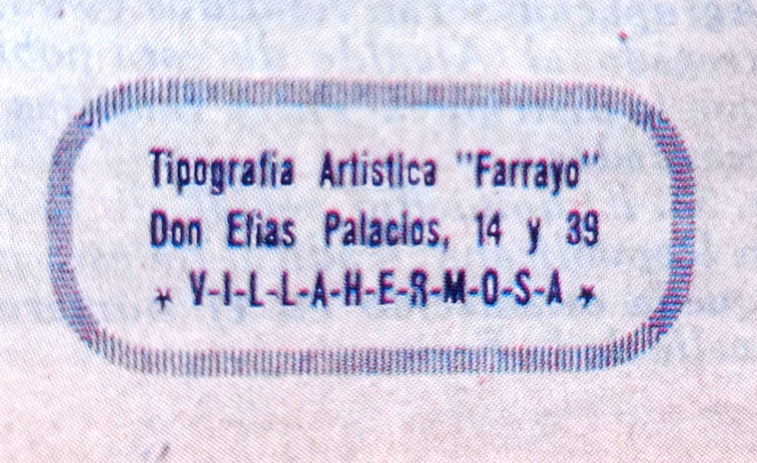 1931. Imprenta. Tipografía Artística "Farrayo". Don Elías Palacios, 14 y 39. Villahermosa |
